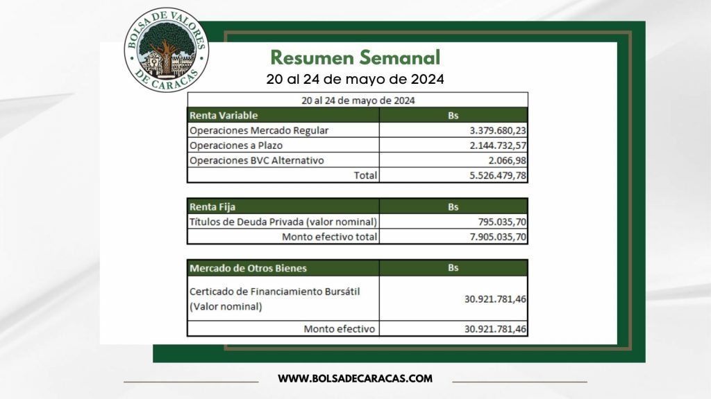 En la Bolsa de Valores de Caracas, entre el 20 y el 24 de mayo de 2024, se negoció un total de 13 millones 431 mil 515 bolívares.