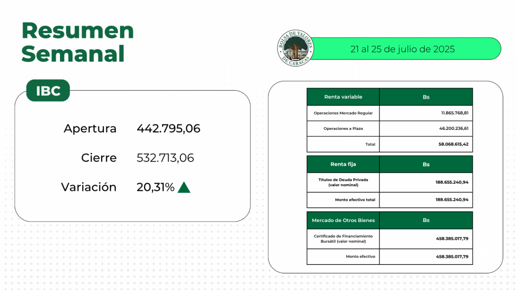 En la Bolsa de Valores de Caracas, entre el 21 y el 25 de julio de 2025, se negoció un total de Bs 705.108.874,15.