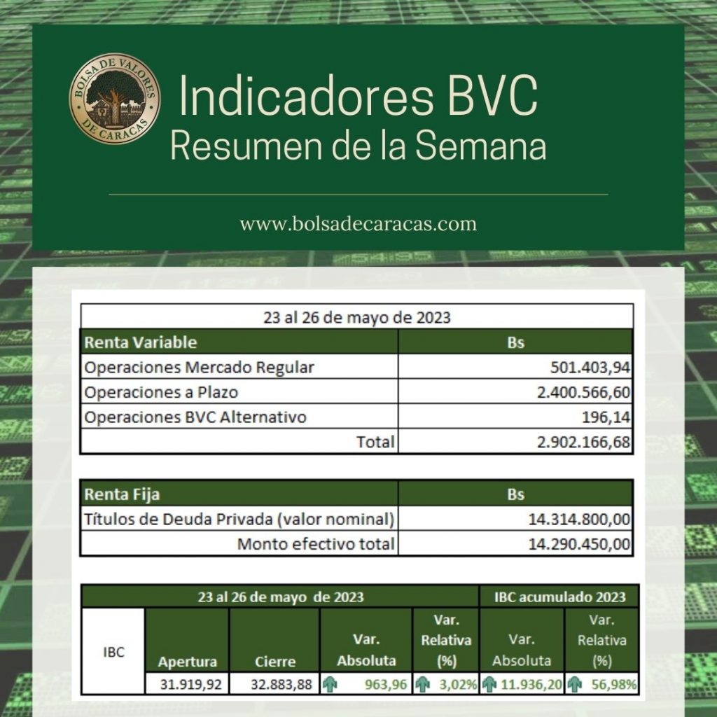 En la Bolsa de Valores de Caracas, entre el 23 y el 26 de mayo de 2023, se negoció un total de 17 millones 192 mil 616 bolívares.
