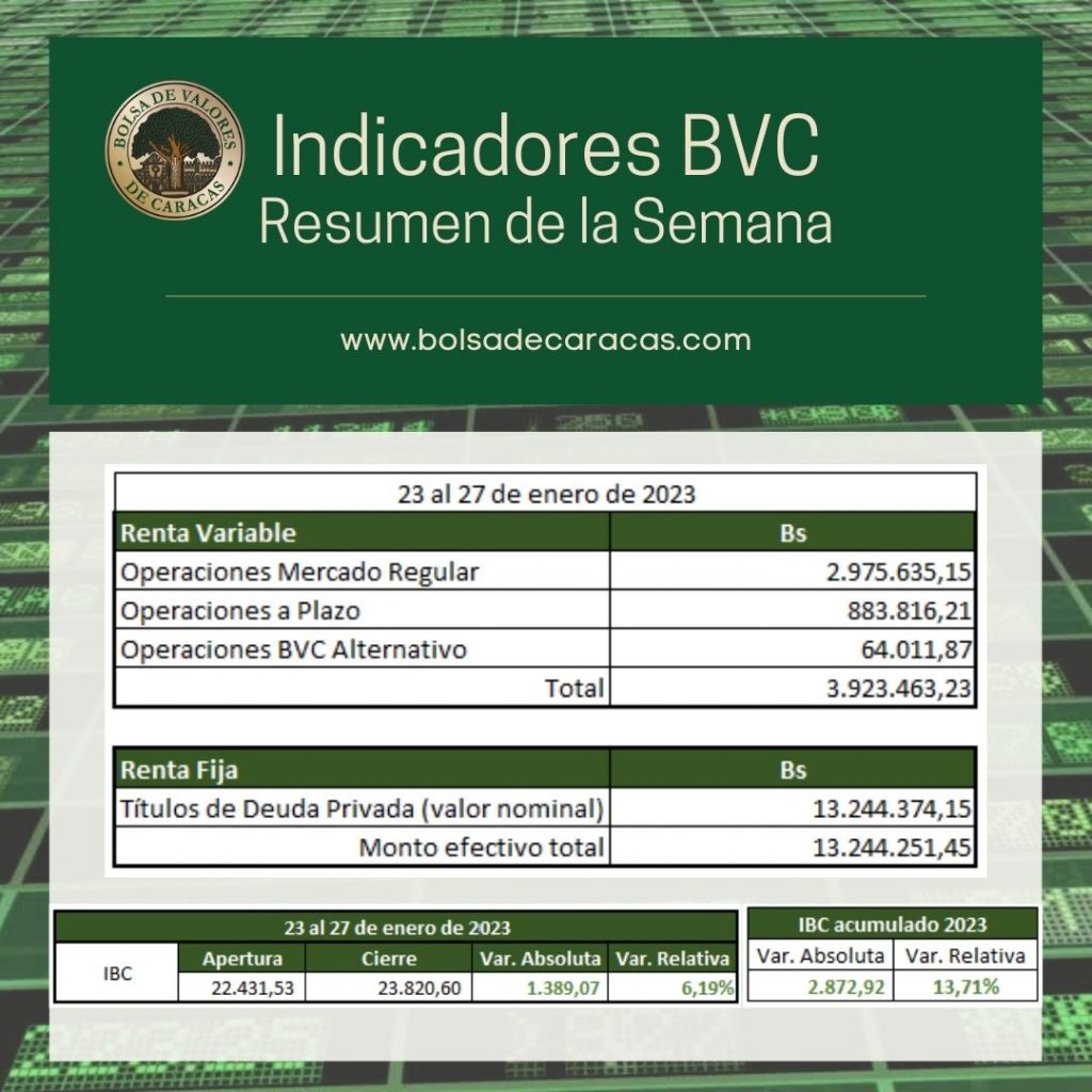 En la Bolsa de Valores de Caracas, entre el 23 y el 27 de enero de 2023, se negoció un total de 17 millones 167 mil 714 bolívares.