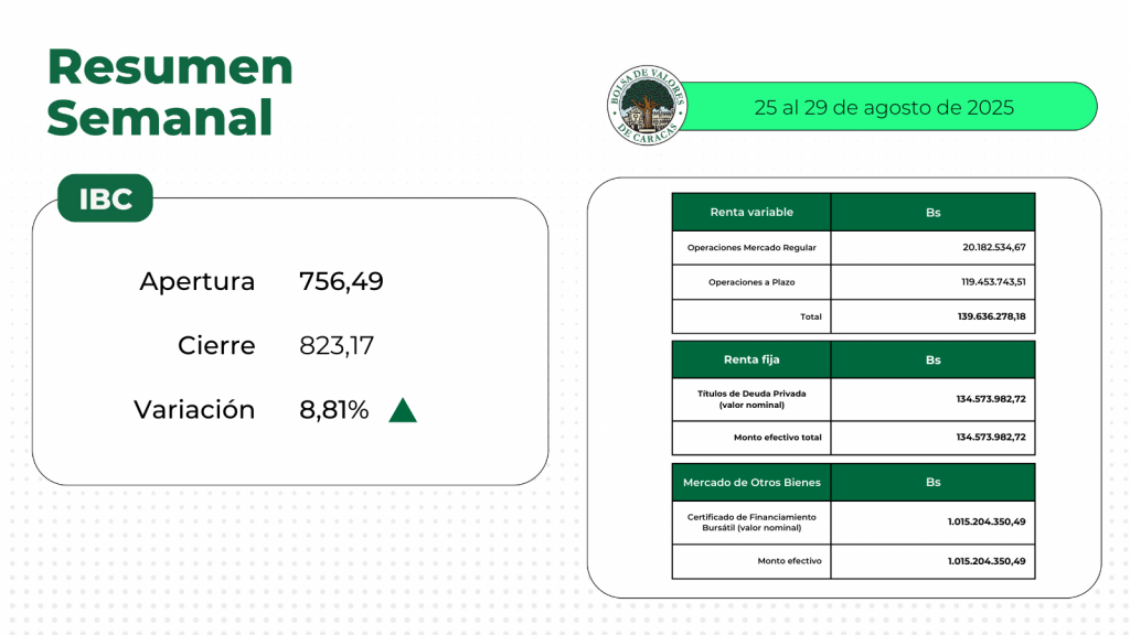 En la Bolsa de Valores de Caracas, entre el 25 y el 29 de agosto de 2025, se negoció un total de Bs 1.289.414.611,39.