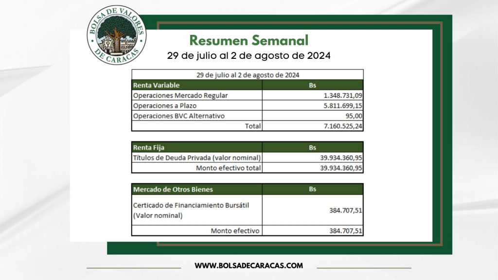 En la Bolsa de Valores de Caracas, entre el 29 de julio y el 2 de agosto de 2024, se negoció un total de 47 millones 479 mil 593 bolívares.