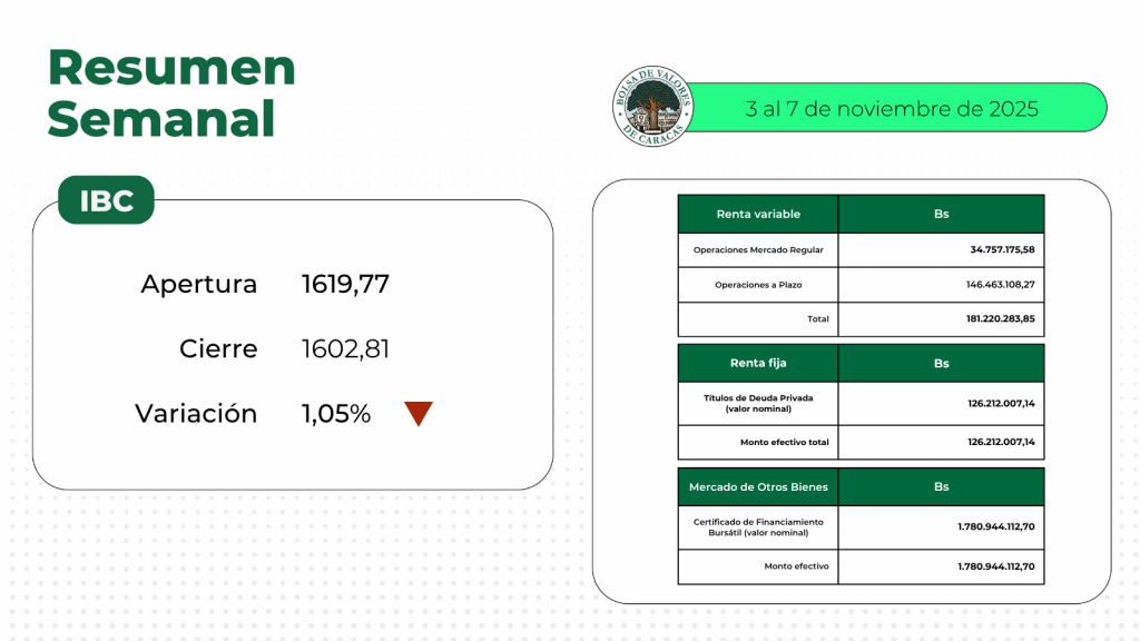 En la Bolsa de Valores de Caracas, entre el 3 y el 7 de noviembre de 2025, se negoció un total de Bs 2.088.376.403,69.