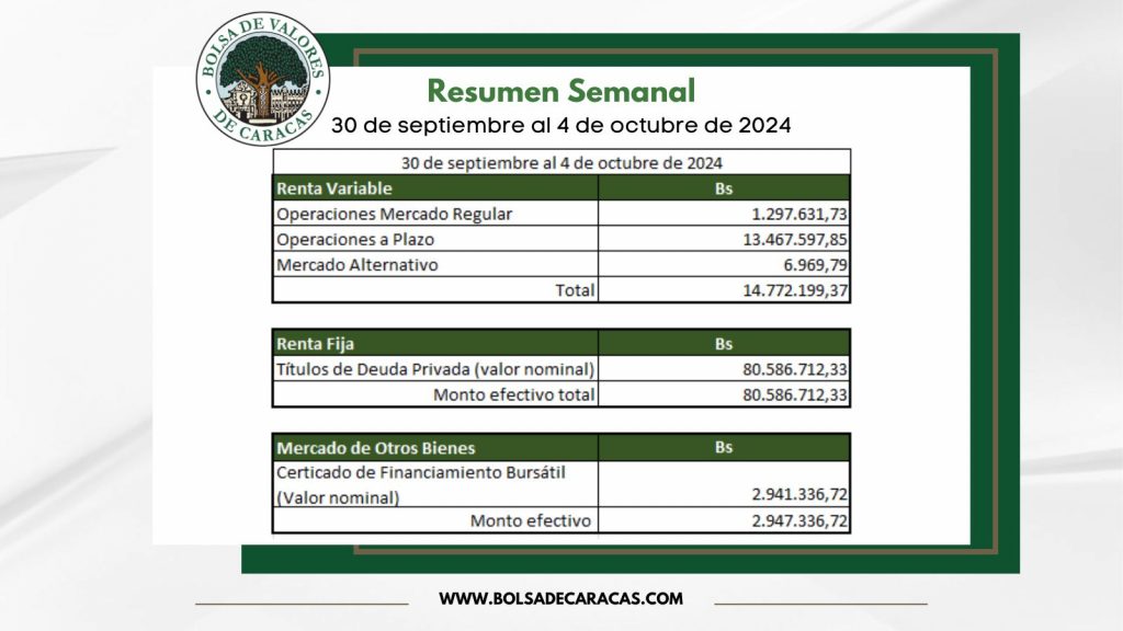 En la Bolsa de Valores de Caracas, entre el 30 de septiembre al 4 de octubre de 2024, se negoció un total de 98 millones 300 mil 248 bolívares.