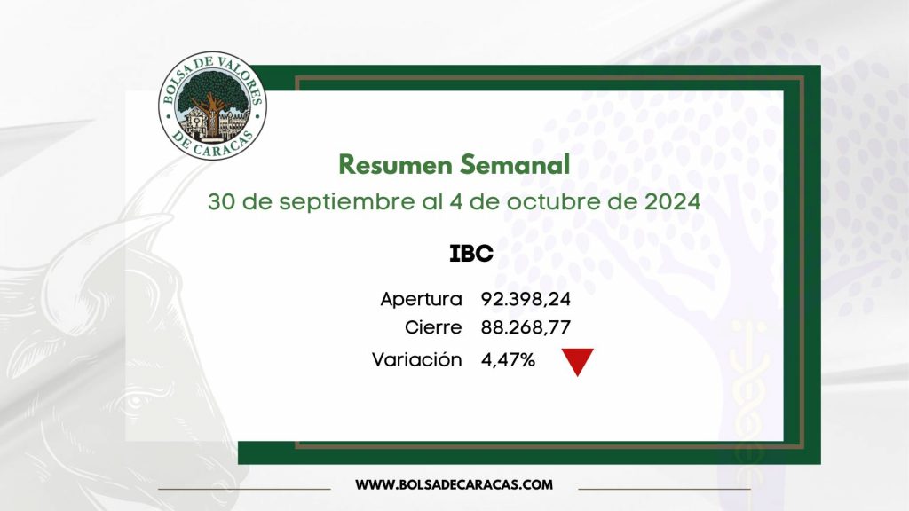 El índice principal de la Bolsa de Valores de Caracas, IBC, abrió el lapso en 92.398,24 puntos y lo cerró en 88.268,77 puntos, con una variación de 4.129,47 puntos (-4,47%) en 5 días de operaciones. En lo que va de año, este indicador registra una variación de 30.436,31 puntos (+52,63%).