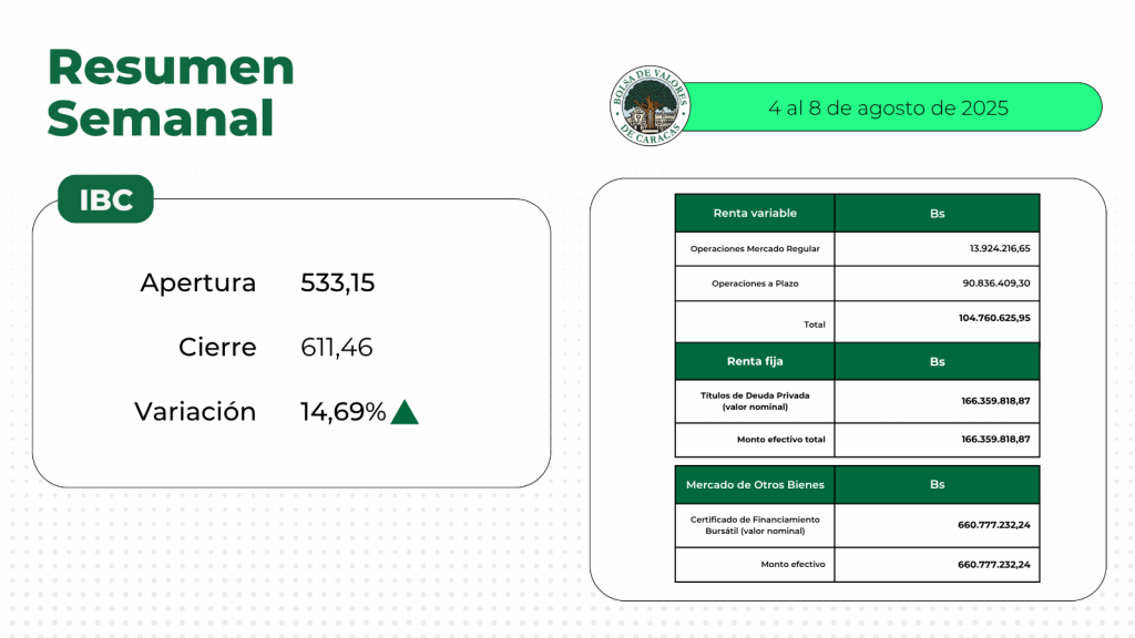 En la Bolsa de Valores de Caracas, entre el 4 y el 8 de agosto de 2025, se negoció un total de Bs 931.897.677,06.