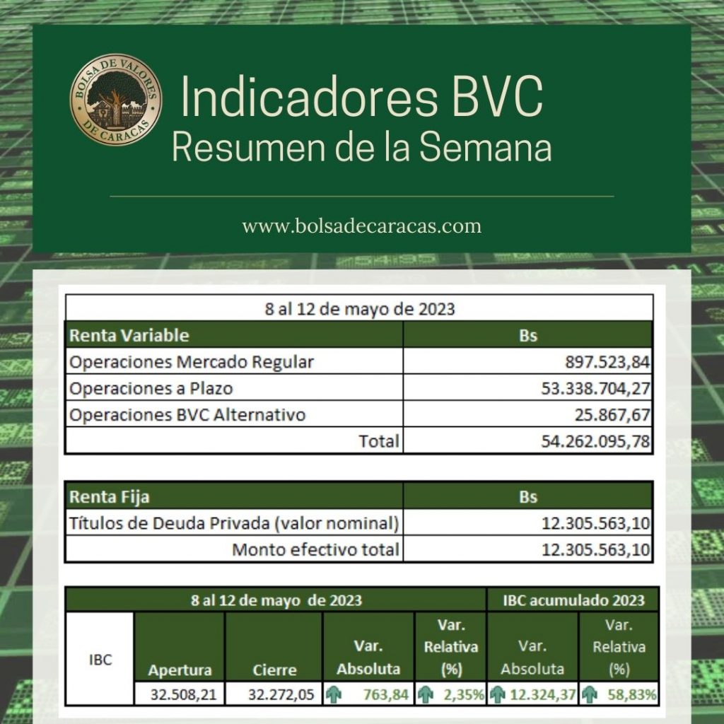 El índice principal de la Bolsa de Valores de Caracas, IBC, abrió el lapso en 32.508,21 puntos y lo cerró en 33.272,05 puntos, con una variación de 763,84 puntos (+2,35%) en 5 días de operaciones. En lo que va de año, este indicador registra una variación de 12.324,37 puntos (+58,83%).