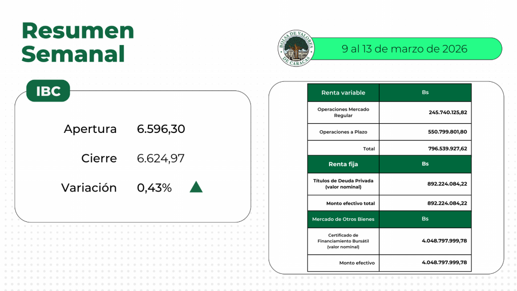 En la Bolsa de Valores de Caracas, entre el 9 y el 13 de marzo de 2026, se negoció un total de Bs 5.737.562.011,62.