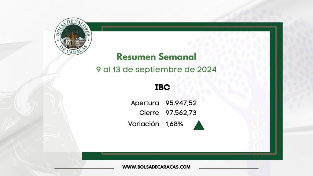 El índice principal de la Bolsa de Valores de Caracas, IBC, abrió el lapso en 95.947,52 puntos y lo cerró en 97.562,73 puntos, con una variación de 1.615,21 puntos (+1,68%) en 5 días de operaciones. En lo que va de año, este indicador registra una variación de 39.730,27 puntos (+68,70%).