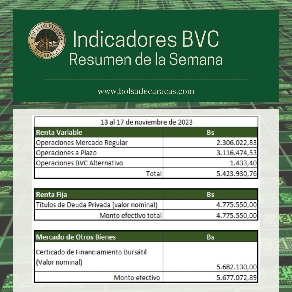 En la Bolsa de Valores de Caracas, entre el 13 y el 17 de noviembre de 2023, se negoció un total de 15 millones 876 mil 553 bolívares.