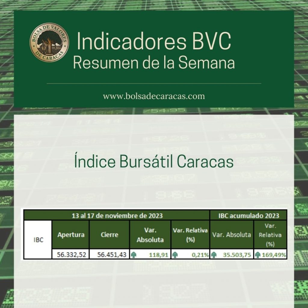 El índice principal de la Bolsa de Valores de Caracas, IBC, abrió el lapso en 56.332,52 puntos y lo cerró en 56.451,43 puntos, con una variación de 118,91 puntos (+0,21%) en 5 días de operaciones. En lo que va de año, este indicador registra una variación de 35.503,75 puntos (+169,49%).