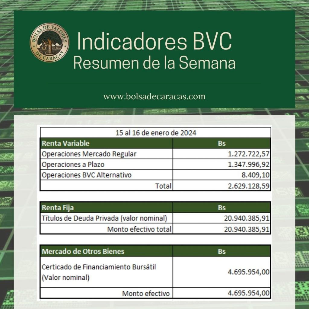 En la Bolsa de Valores de Caracas, entre el 15 y el 19 de enero de 2024, se negoció un total de 28 millones 265 mil 468 bolívares.