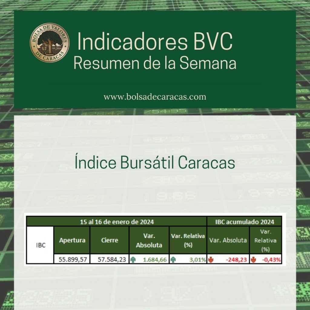 El índice principal de la Bolsa de Valores de Caracas, IBC, abrió el lapso en 55.899,57 puntos y lo cerró en 57.584,23 puntos, con una variación de 1.684,66 puntos (+3,01%) en 5 días de operaciones. En lo que va de año, este indicador registra una variación de 248,23 puntos (-0,43%).