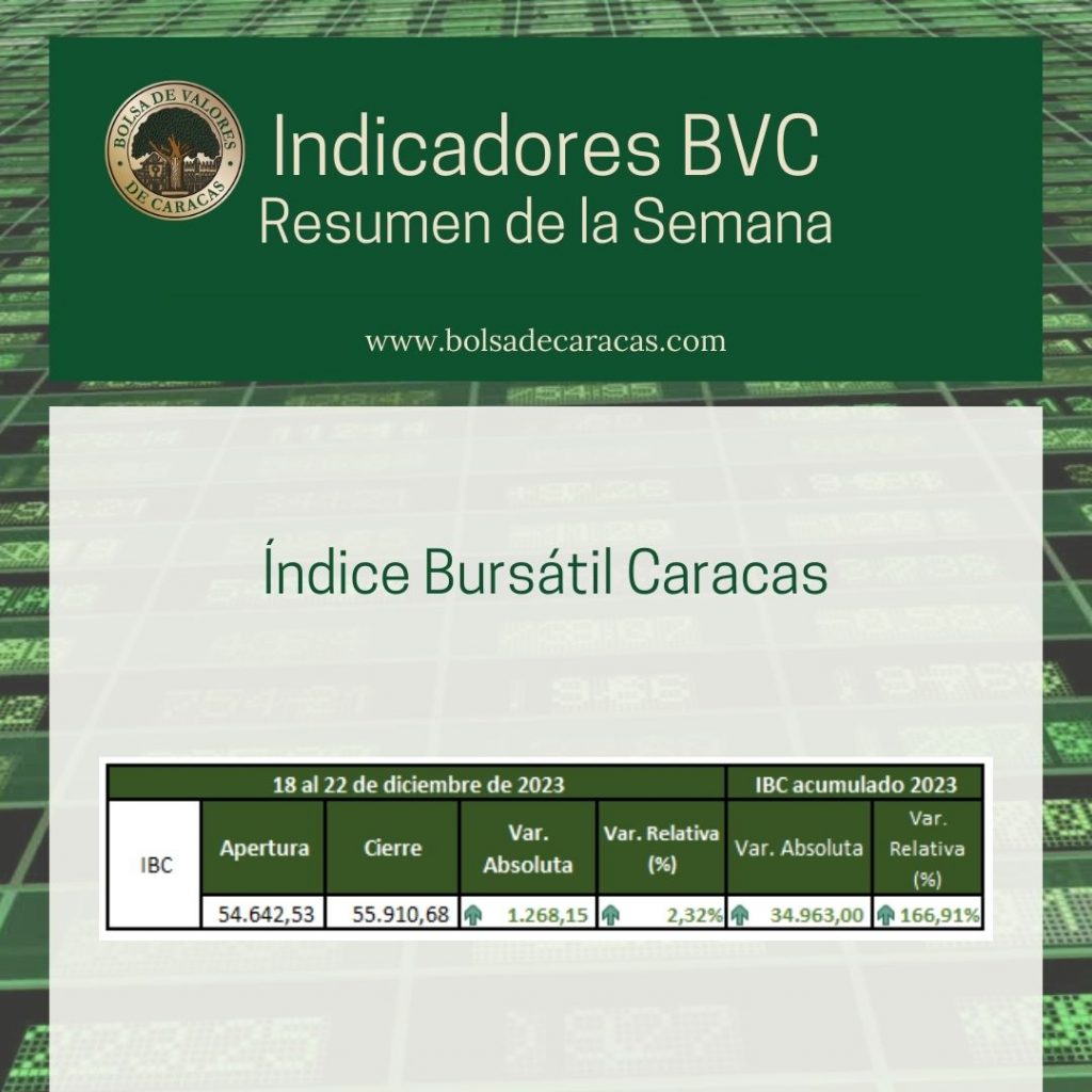 El índice principal de la Bolsa de Valores de Caracas, IBC, abrió el lapso en 54.642,53 puntos y lo cerró en 55.910,68 puntos, con una variación de 1.268,15 puntos (+2,32%) en 5 días de operaciones. En lo que va de año, este indicador registra una variación de 34.963,00 puntos (+166,91%).