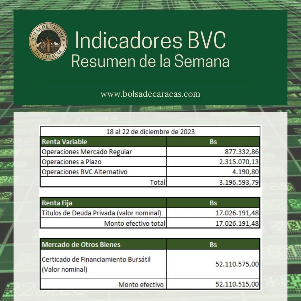 En la Bolsa de Valores de Caracas, entre el 18 y el 22 de diciembre de 2023, se negoció un total de 74 millones 549 mil 255 bolívares.