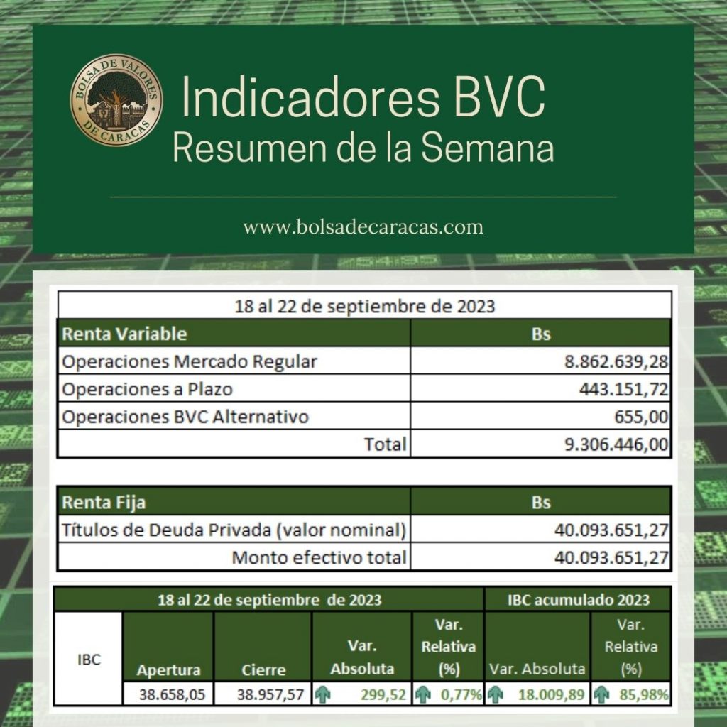 En la Bolsa de Valores de Caracas, entre el 18 y el 22 de septiembre de 2023, se negoció un total de 49 millones 400 mil 097 bolívares.