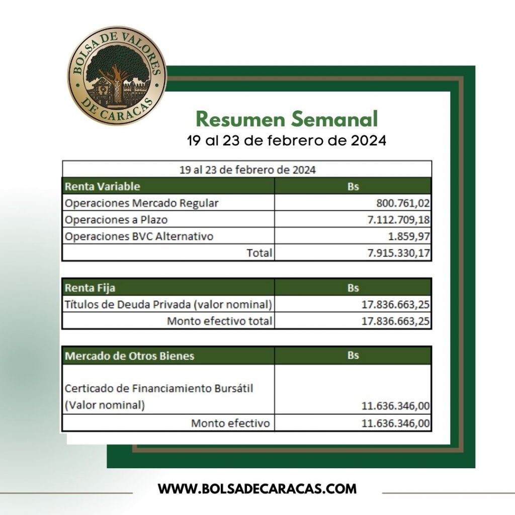 En la Bolsa de Valores de Caracas, entre el 19 y el 23 de febrero de 2024, se negoció un total de 37 millones 388 mil 339 bolívares.