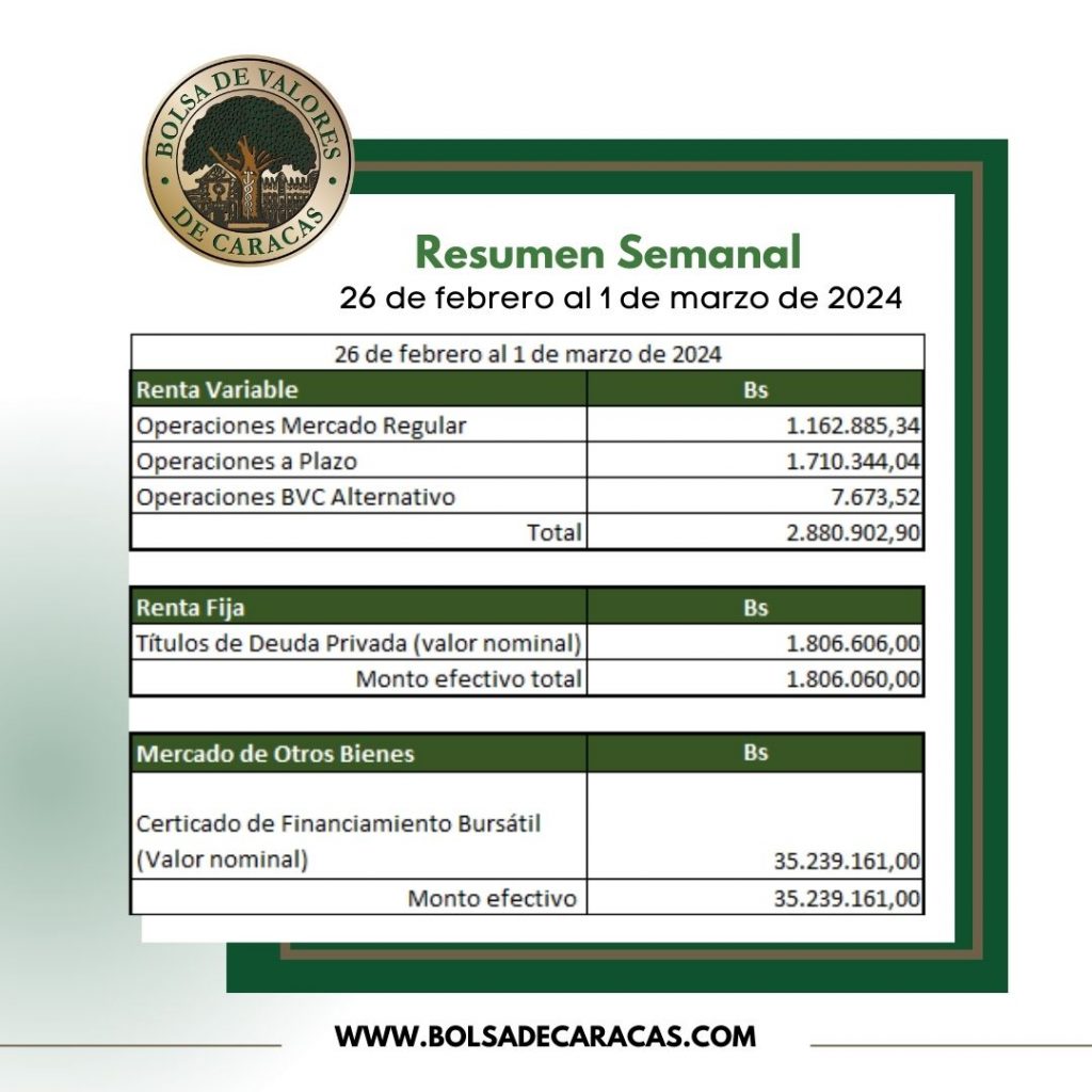 En la Bolsa de Valores de Caracas, entre el 26 de febrero y el 1 de marzo de 2024, se negoció un total de 39 millones 926 mil 124 bolívares.
