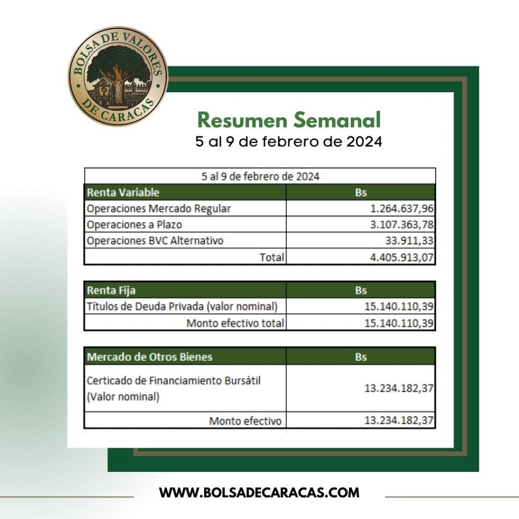En la Bolsa de Valores de Caracas, entre el 5 y el 9 de febrero de 2024, se negoció un total de 32 millones 780 mil 205 bolívares.