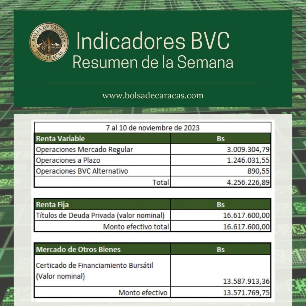 En la Bolsa de Valores de Caracas, entre el 7 y el 10 de noviembre de 2023, se negoció un total de 34 millones 445 mil 596 bolívares.