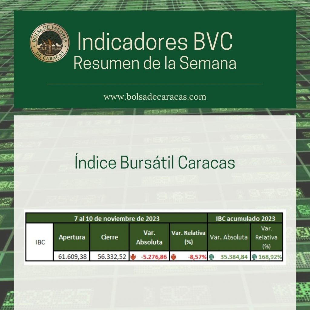 El índice principal de la Bolsa de Valores de Caracas, IBC, abrió el lapso en 61.609,38 puntos y lo cerró en 56.332,52 puntos, con una variación de 5.276,86 puntos (-8,57%) en 4 días de operaciones. En lo que va de año, este indicador registra una variación de 35.384,84 puntos (+168,92%).