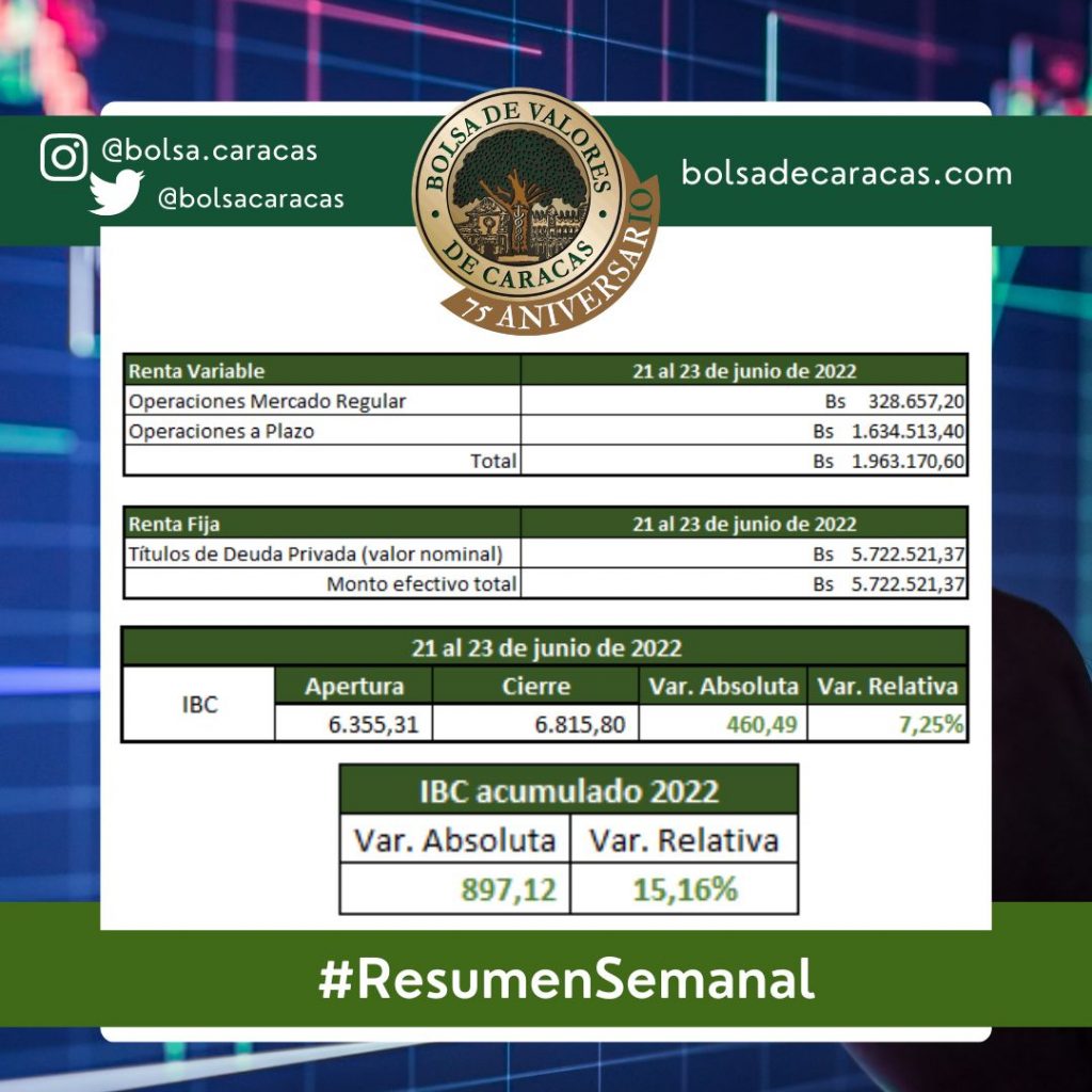 En la Bolsa de Valores de Caracas, entre el 21 y el 23 de junio de 2022, se negoció un total de 7 millones 685 mil 691 bolívares.