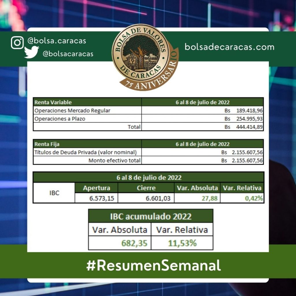 En la Bolsa de Valores de Caracas, entre el 6 y el 8 de julio de 2022, se negoció un total de 2 millones 600 mil 022 bolívares.