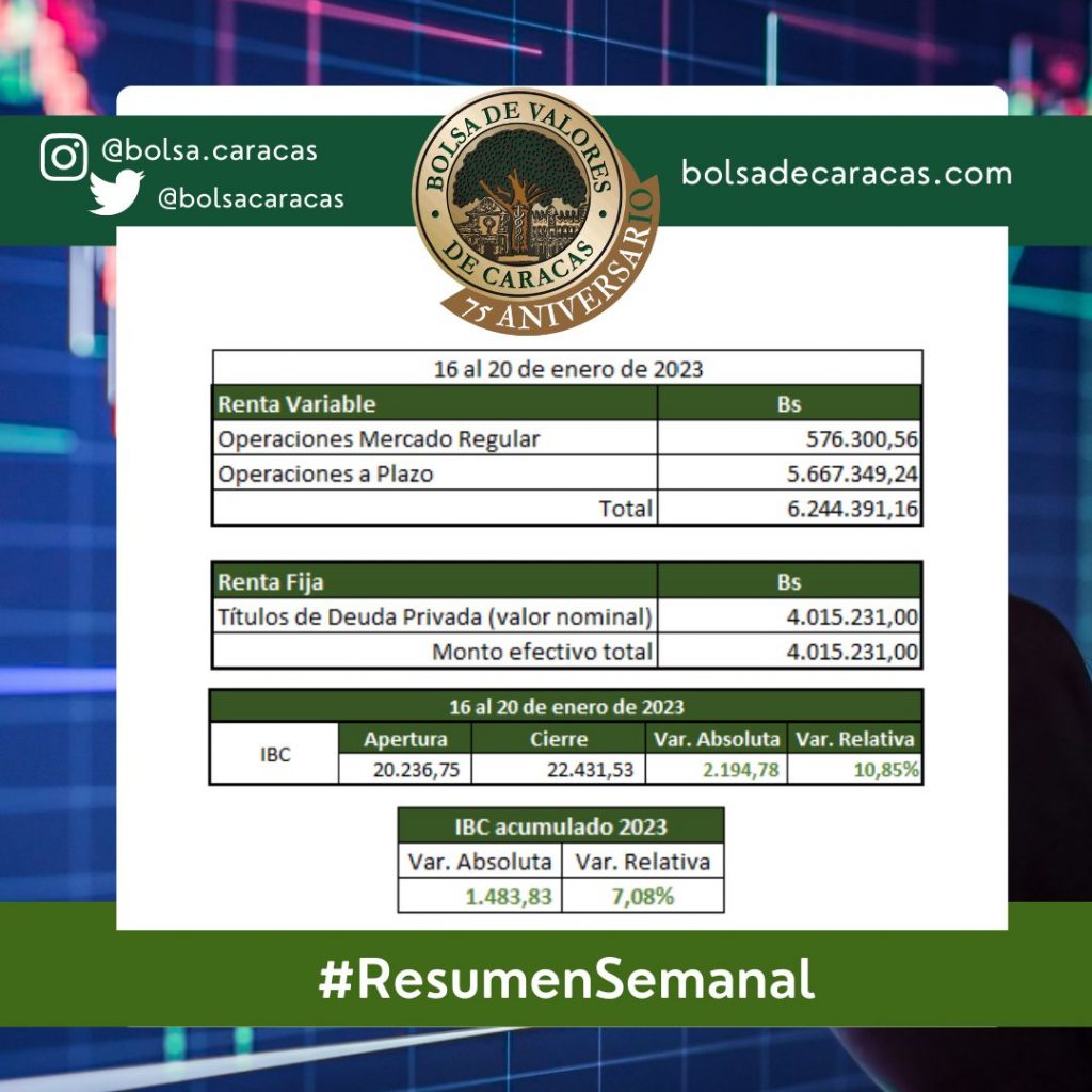 En la Bolsa de Valores de Caracas, entre el 16 y el 20 de enero de 2023, se negoció un total de 10 millones 259 mil 622 bolívares.
