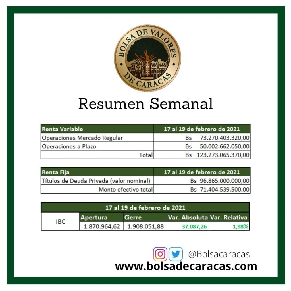 En la semana del 17 al 19 de febrero de 2021, el monto negociado en la Bolsa de Valores de Caracas totalizó 123 mil 273 millones 065 mil 370 bolívares.