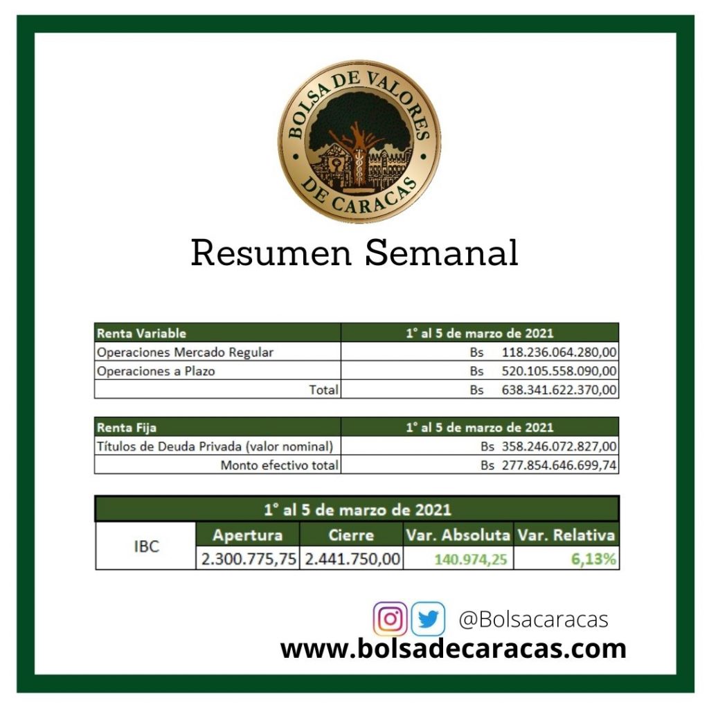 El índice principal de la Bolsa de Valores de Caracas, IBC, abrió el lapso en 2.300.775,75 puntos y lo cerró en 2.441.750,00 puntos, con una variación de 140.974,25 puntos, lo que se significó una variación de (+6,13%) en 5 días de operaciones, con respecto a la semana anterior.