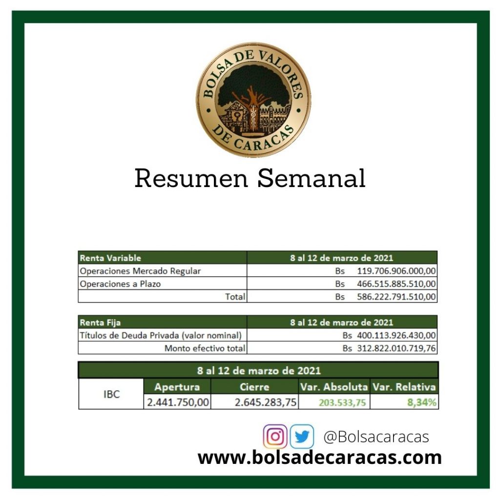 En la semana del 8 al 12 de marzo de 2021, el monto negociado en la Bolsa de Valores de Caracas totalizó 586 mil 222 millones 791 mil 510 bolívares.