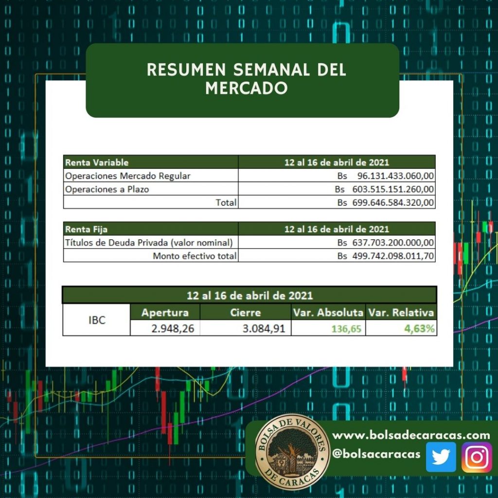 En la semana del 12 al 16 de abril de 2021, el monto negociado en la Bolsa de Valores de Caracas totalizó 699 mil 646 millones 584 mil 320 bolívares.