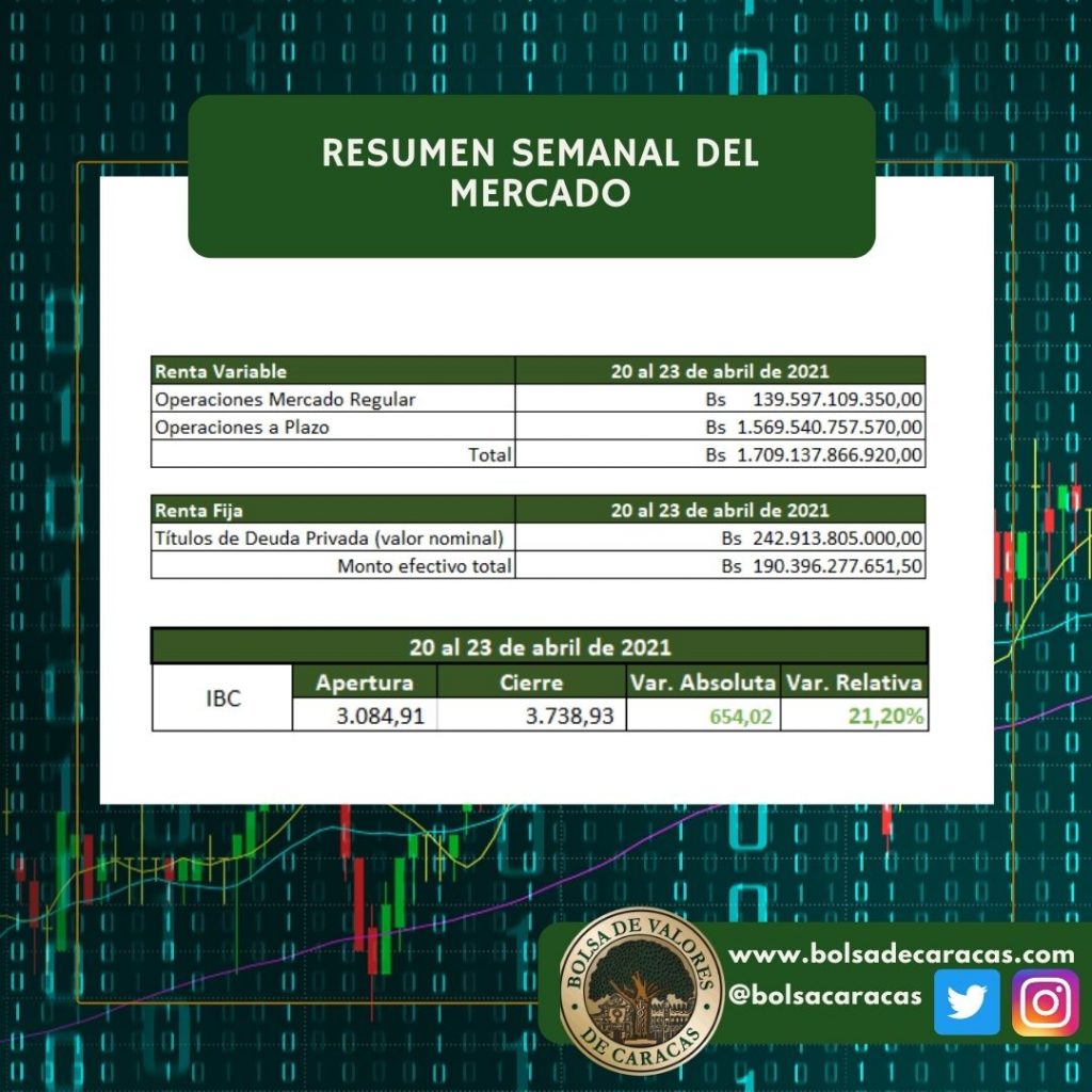 En la semana del 20 al 23 de abril de 2021, el monto negociado en la Bolsa de Valores de Caracas totalizó un billón 709 mil 137 millones 866 mil 920 bolívares.