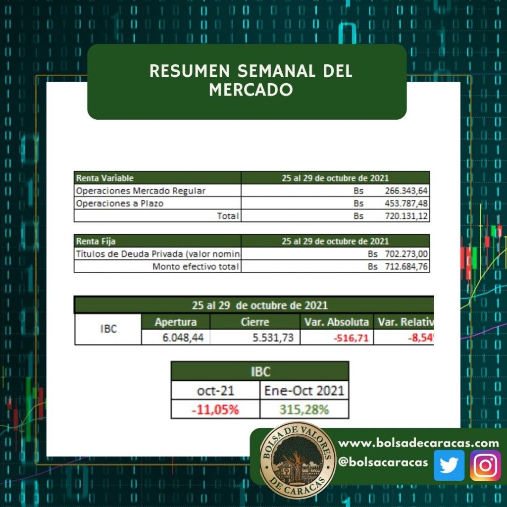 El índice principal de la Bolsa de Valores de Caracas, IBC, abrió el lapso en 6.048,44 puntos y lo cerró en 5.531,73 puntos, con una variación de 516,71 puntos, lo que se significó una variación de (-8,54%) en 5 días de operaciones. En lo que va de año, este indicador registra una variación de (+3,15%), arrancó el 2021 en 1.332,06 puntos y al cierre de octubre se ubicó 5.531,73 puntos.