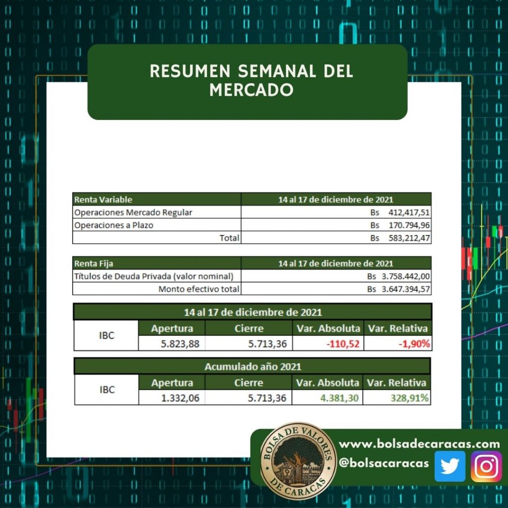 El monto negociado en la Bolsa de Valores de Caracas, entre el 14 y el 17 de diciembre de 2021, totalizó 583 mil 212 bolívares.
