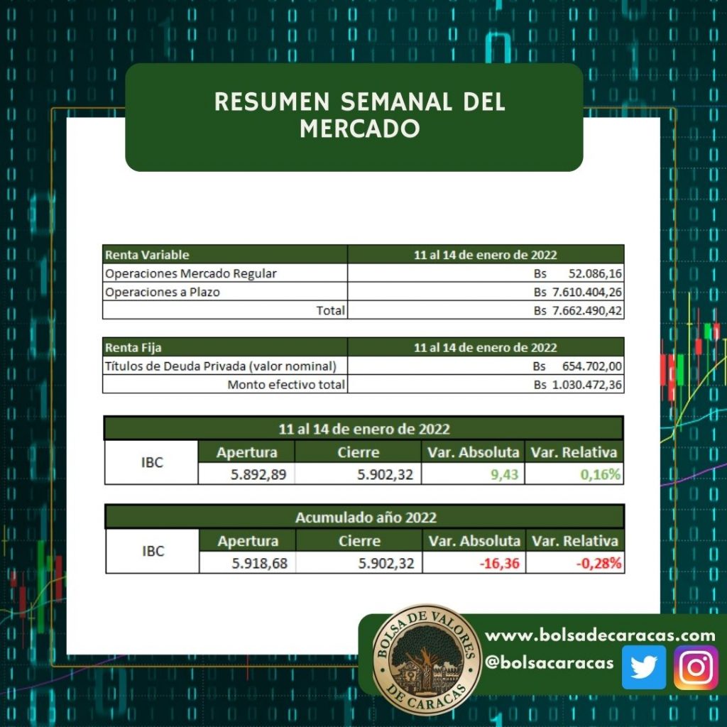 El monto negociado en la Bolsa de Valores de Caracas, entre el 11 y el 14 de enero de 2022, totalizó 7 millones 662 mil 490 bolívares.