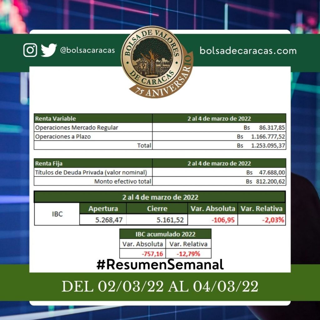 En la Bolsa de Valores de Caracas, entre el 2 y el 4 de marzo de 2022, se negoció un total de 2 millones 065 mil 295 bolívares.