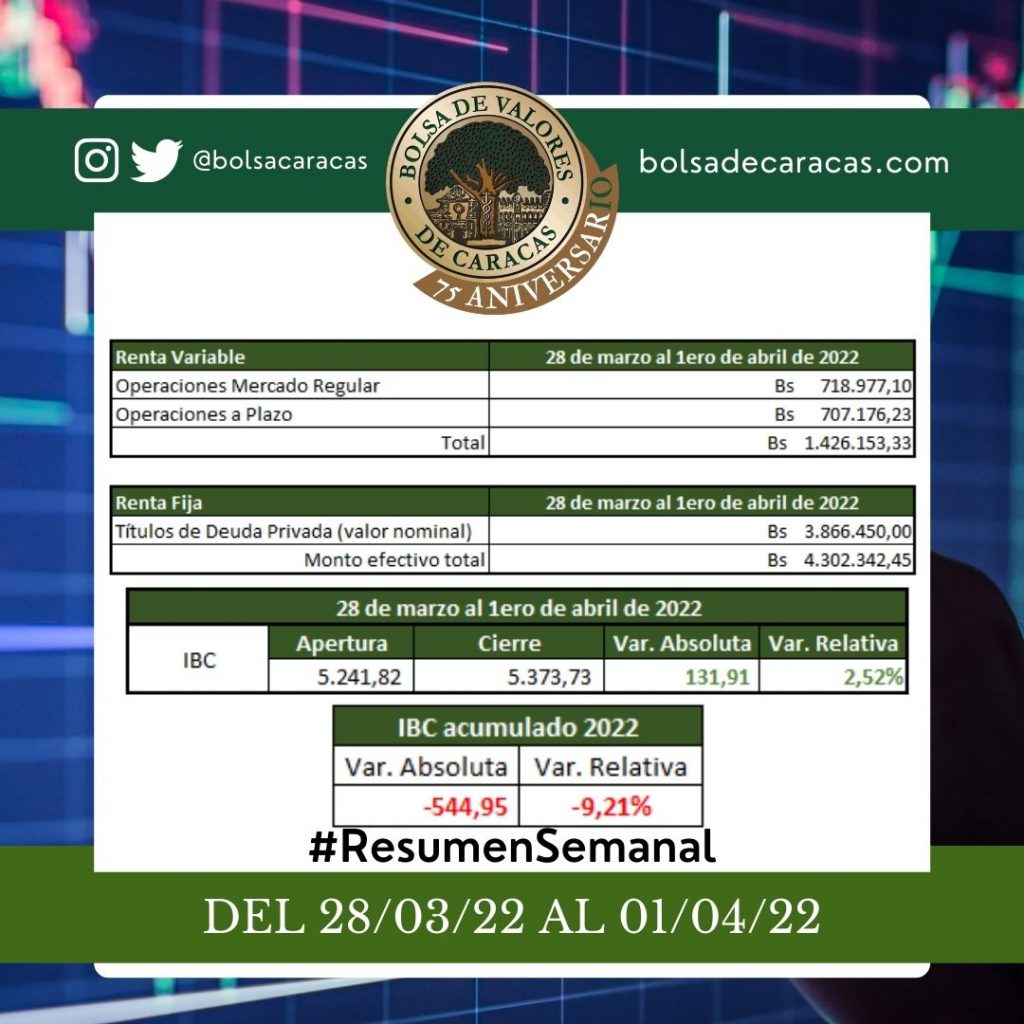 En la Bolsa de Valores de Caracas, entre el 28 de marzo y el 1ero. de abril de 2022, se negoció un total de 5 millones 728 mil 495 bolívares.