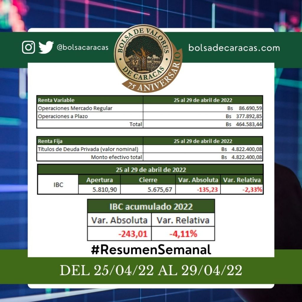 En la Bolsa de Valores de Caracas, entre el 25 y el 29 de abril de 2022, se negoció un total de 5 millones 286 mil 983 bolívares.