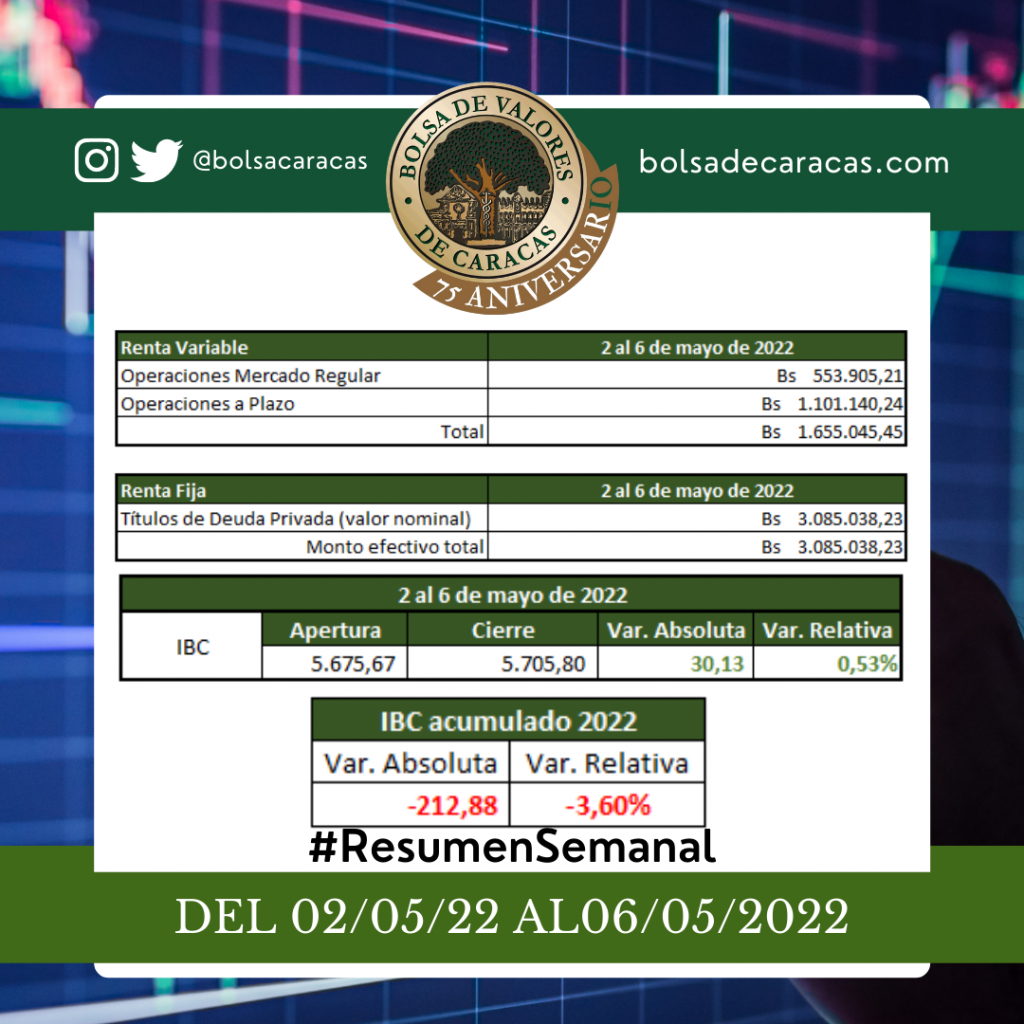 En la Bolsa de Valores de Caracas, entre el 2 y el 6 de mayo de 2022, se negoció un total de 4 millones 740 mil 083 bolívares.