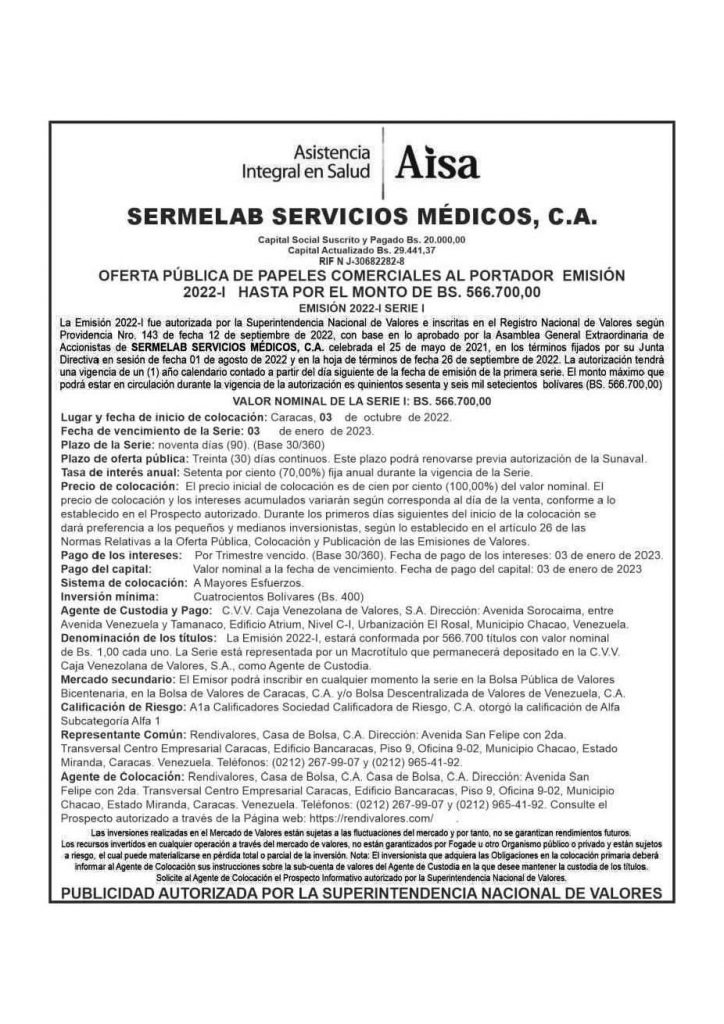 Los títulos para colocar son los correspondientes a la Serie I, de la Emisión 2022-I, de Papeles Comerciales de SERMELAB SERVICIOS MÉDICOS, C.A.
