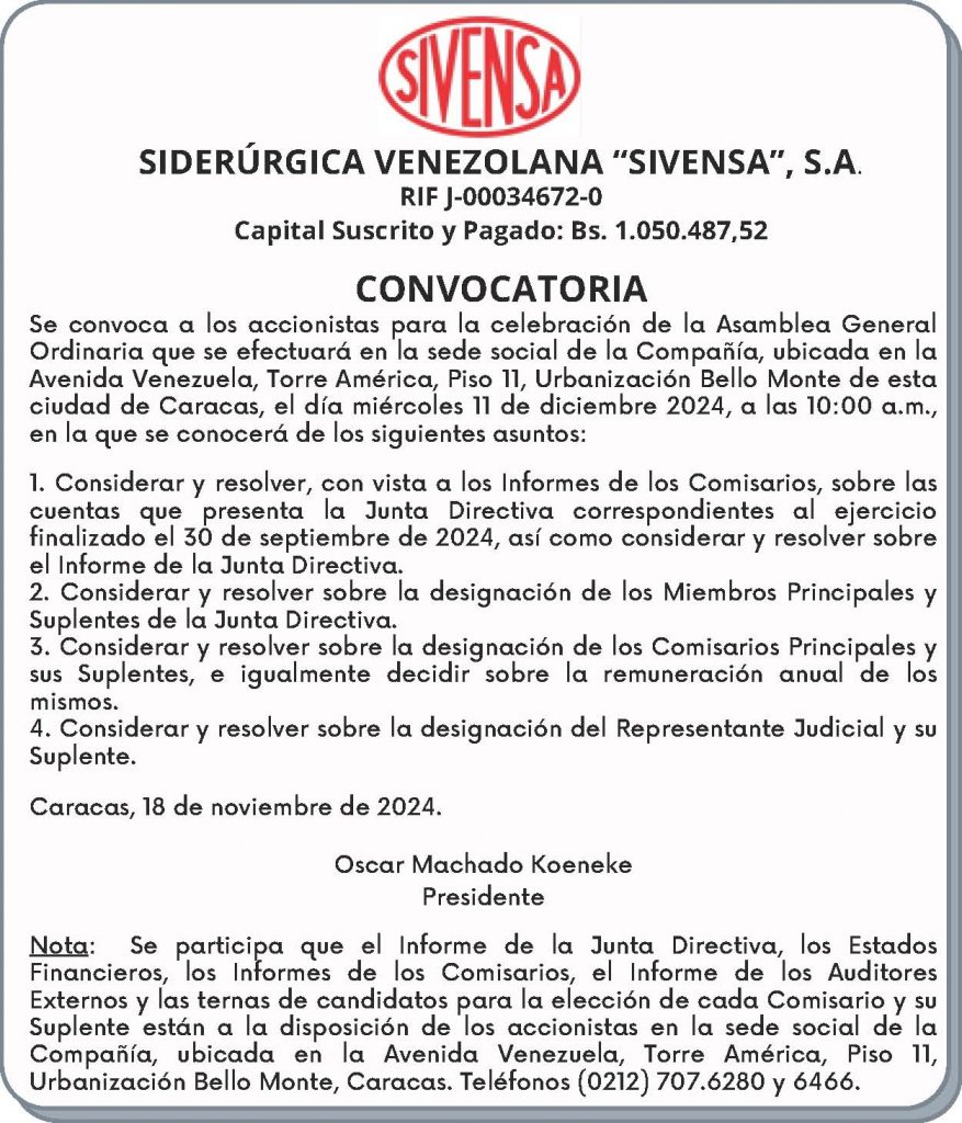 Se convoca a los accionistas para la celebración de la Asamblea General Ordinaria que se efectuará en la sede social de la Compañía, ubicada en la Avenida Venezuela, Torre América, Piso 11, Urbanización Bello Monte de esta ciudad de Caracas, el día miércoles 11 de diciembre de 2024, a las 10:00 a.m., en la que se conocerá de los siguientes asuntos: