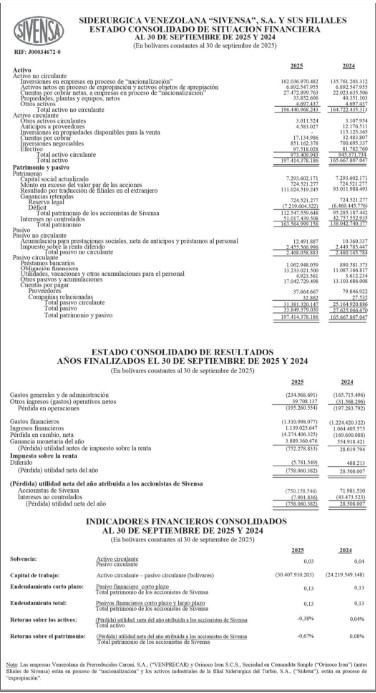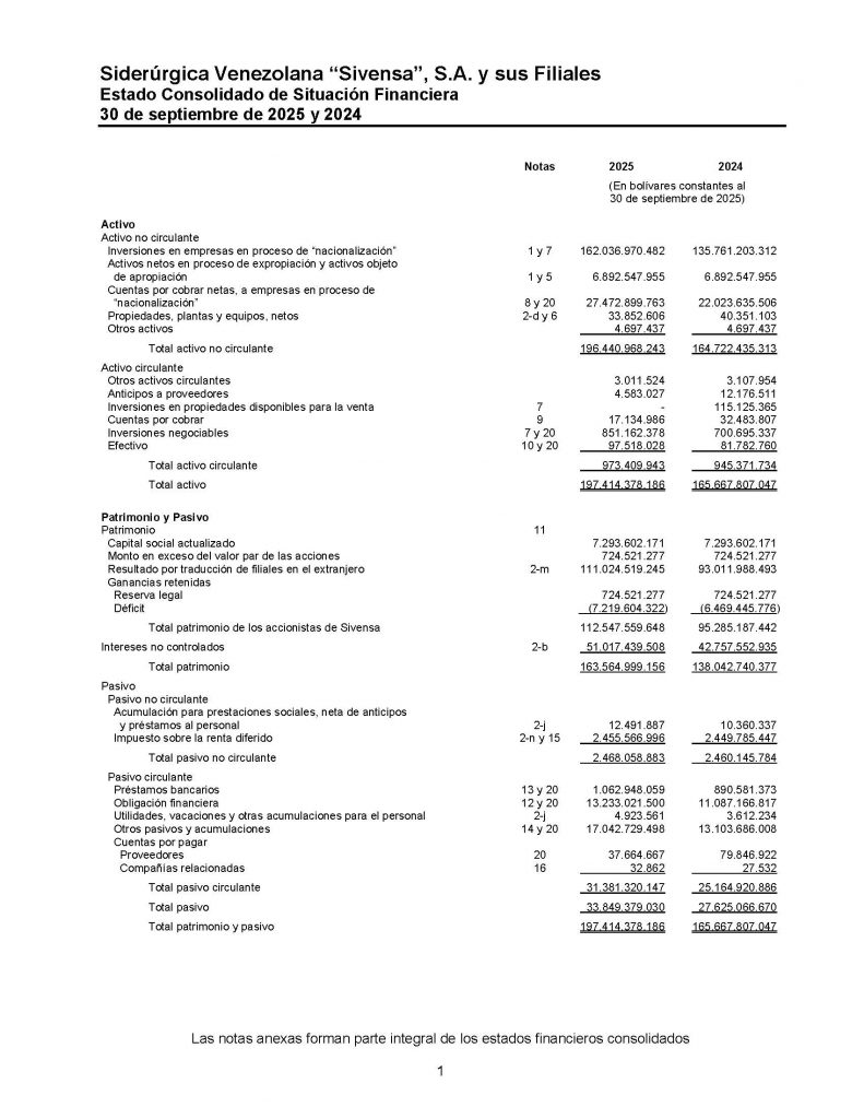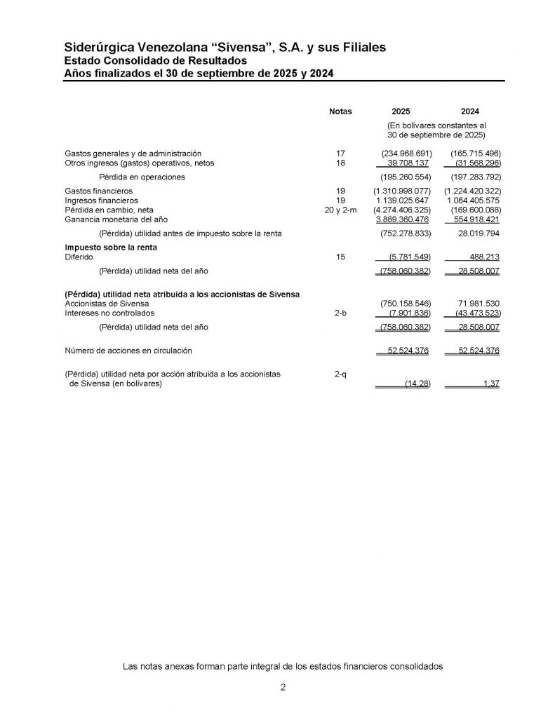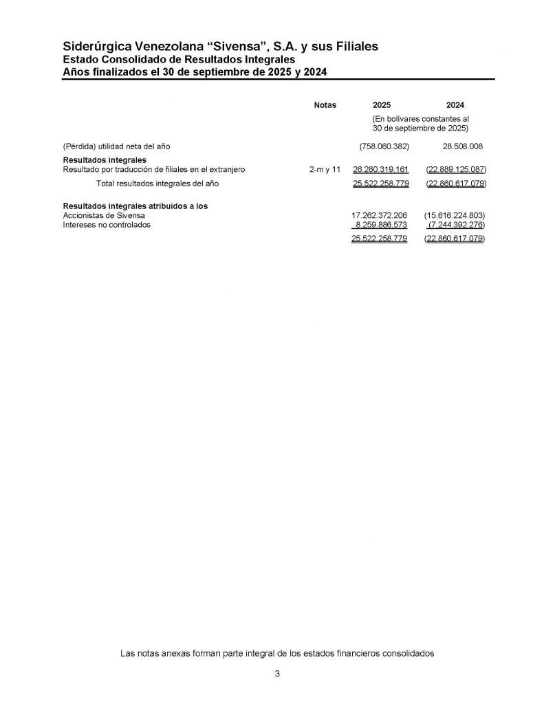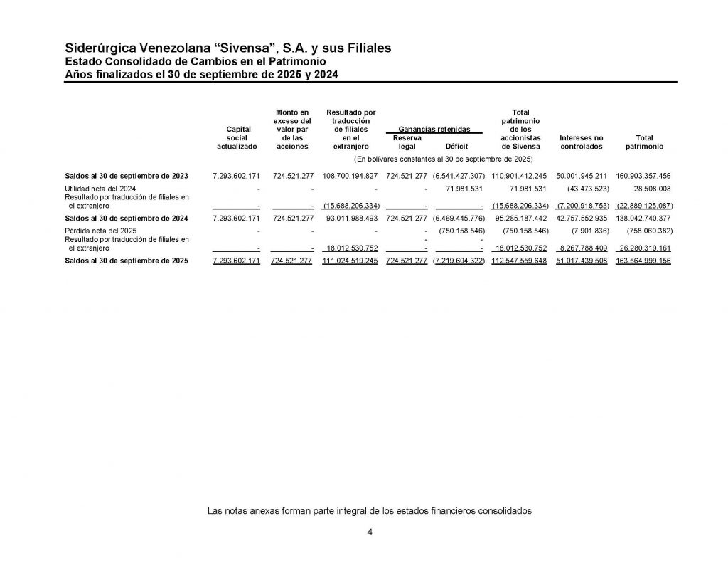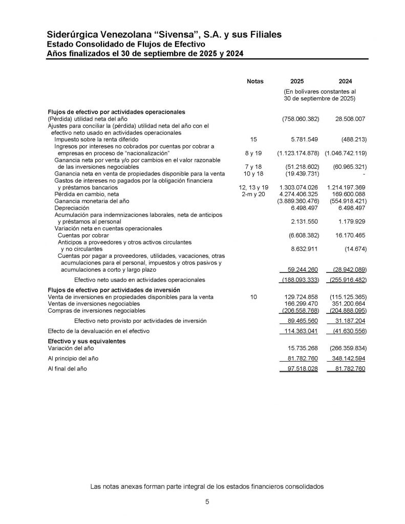 Estado Consolidado de Resultados, año finalizado el 30 de septiembre de 2025-2024, en bolívares constantes a dicha fecha. Estado Consolidado de Resultados Integrales años finalizado el 30 de septiembre de 2025 -2024, Estado Consolidado de Cambios en el Patrimonio y Estado Consolidado de Flujos de Efectivo.