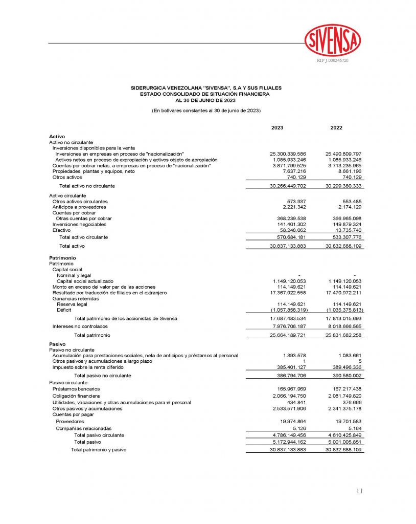 Estado Consolidado de Situación Financiera, al 30 de junio de 2023, en bolívares constantes a dicha fecha.