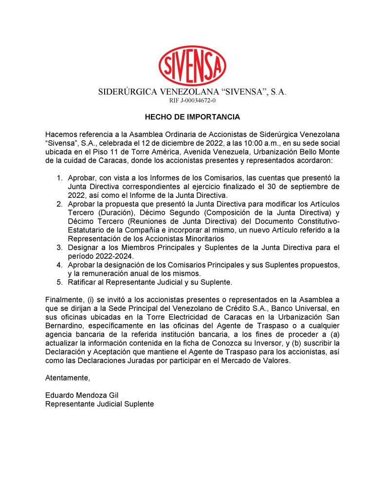 La Asamblea Ordinaria de Accionistas de Siderúrgica Venezolana “Sivensa”, S.A., celebrada el 12 de diciembre de 2022, a las 10:00 a.m., en su sede social ubicada en el Piso 11 de Torre América, Avenida Venezuela, Urbanización Bello Monte de la cuidad de Caracas, donde los accionistas presentes y representados acordaron: