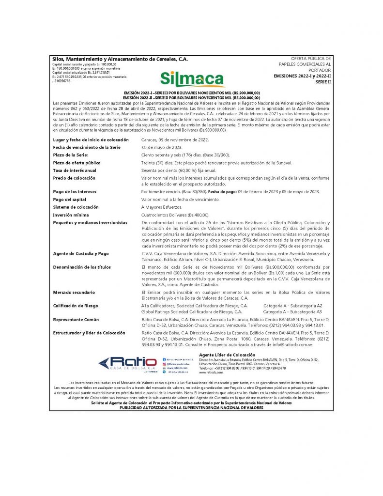Los títulos para colocar serían los correspondientes a la Serie II, de las Emisiones 2022-I y 2022-II, de Papeles Comerciales al Portador, emitidos por la Empresa Emisora SILOS, MANTENIMIENTO Y ALMACENAMIENTO DE CEREALES, C.A. (SILMACA).