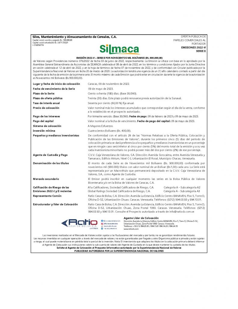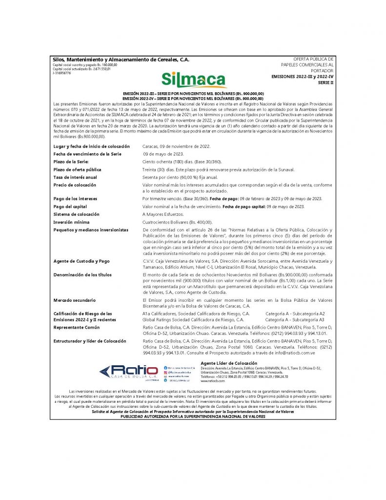 SILOS, MANTENIMIENTO Y ALMACENAMIENTO DE CEREALES, C.A. (SILMACA). EMISIÓN 2022-III, EMISIÓN 2022-IV Y EMISIÓN 2022-V