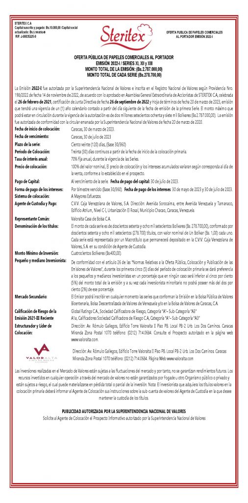 Los títulos que se colocaran son los correspondientes a las Series XI, XII y XIII, de la Emisión 2022-I, de Papeles Comerciales al Portador, emitidos por la Empresa Emisora STERITEX, C.A.