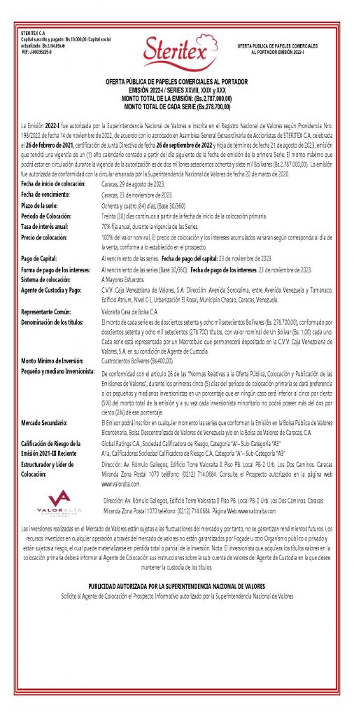 Los títulos que se colocaran son los correspondientes a las Series XXVIII, XXIX y XXX de la Emisión 2022-I, de Papeles Comerciales al Portador, emitidos por la Empresa Emisora STERITEX, C.A.