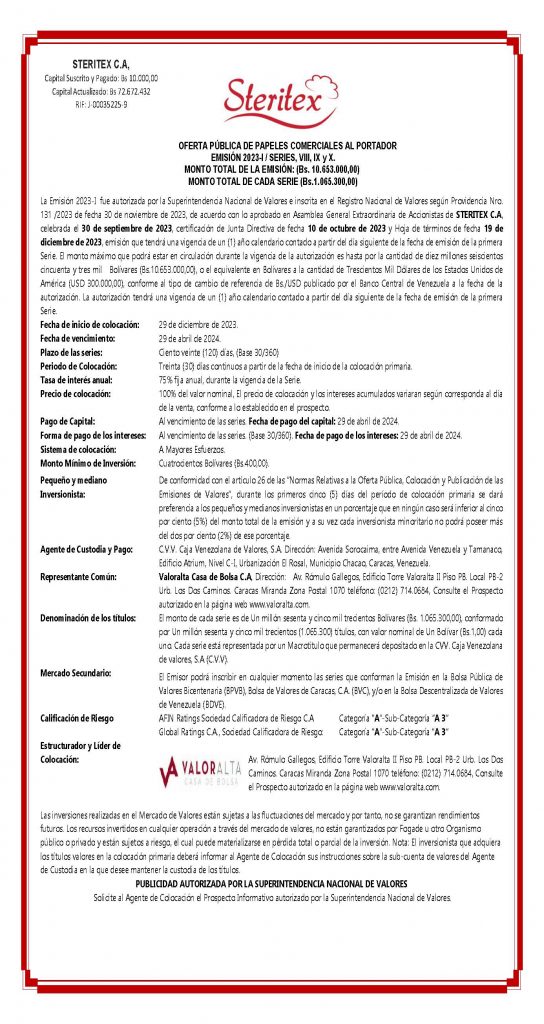 Los títulos que se colocaran son los correspondientes a las Series VIII, IX y X de la Emisión 2023-I, de Papeles Comerciales al Portador, emitidos por la Empresa Emisora STERITEX, C.A.